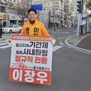 오늘 아침 대왕암 봉사활동을 갔습니다. 참가한 정치인들에게 30초 인사시간을 주었습니다. "저는 요즘 울산과학대 앞에서 청소노동자 문제 해결하라는 피켓을 들고 일인 시위를 하고있습니다." "올해안에 반드시 해결되어 우리동구가 좀더 나은 모습으로 바뀌었으면 좋겠습니다." "그렇게 될 수 있도록 많은 관심 부탁드립니다." 건강하고 행복하십시오. 라고 인사를 마무리 하였습니다. 회원중 어떤분이 "이장우 최고다" 하셨습니...