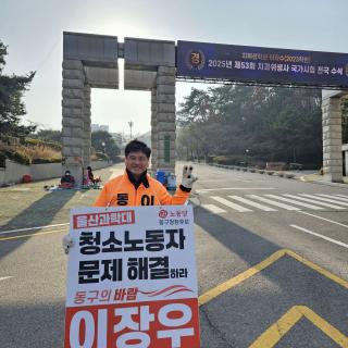 대왕암공원 대왕암지킴이 청소 봉사 현장에 들렀습니다. 늘 끝까지 함께했지만, 선거운동 일정으로 이번에는 인사만 드렸습니다. 대왕암공원을 지키는 고마운 분들입니다. 사무실 개소식 부산 진구 구의원으로 출마한 노동당 김상희 후보님의 사무실 개소식에 다녀왔습니다. 많은 분들이 함께해 주셨습니다. 어려운 여건 속에서도 지역 진보운동을 이어온 후보님의 힘이 느껴지는 자리였습니다. 울산과학대 청소노동자 농성장 울산...